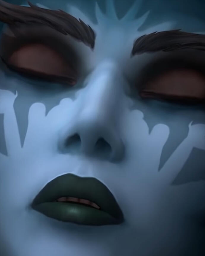 Naamah is seen with black lipstain and markings under her eyes as well